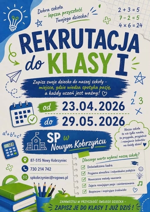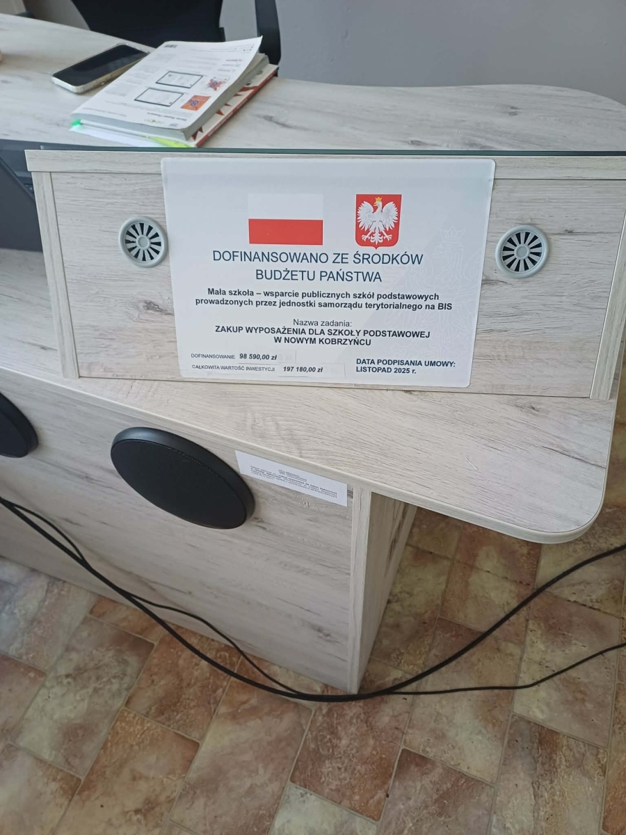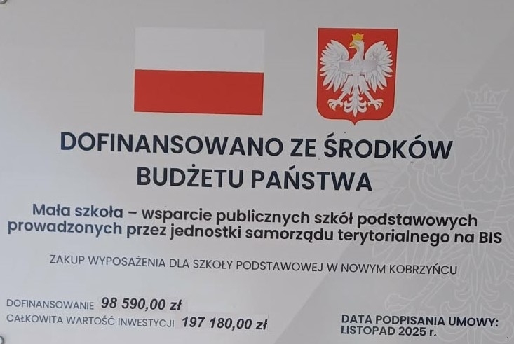 Zadanie publiczne pn. „Zakup wyposażenia dla Szkoły Podstawowej w Nowym Kobrzyńcu” dofinansowano ze środków Ministerstwa Edukacji Narodowej, zgodnie z zawartą umową nr MEN/2025/DFS/1473 z dnia 26.11.2025 r.